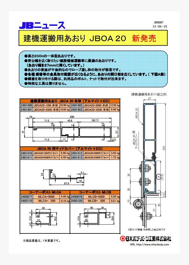 JBアルミサイドバンパー100H用のエンドキャップとショートコーナーが新発売になりました。サイドバンパー分断箇所の安全対策としてご使用ください。ショートコーナーはJABIA/自動車車体規格のサイドバンパー分断箇所に適合する設計です。