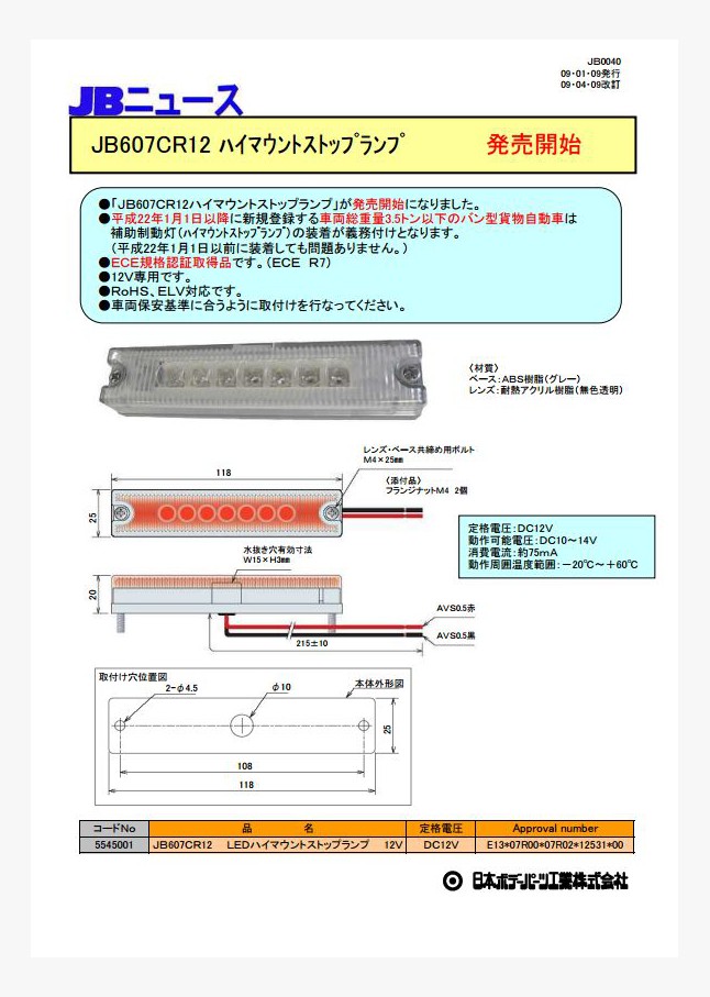 「JB607CR12ハイマウントストップランプ」が発売開始になりました。