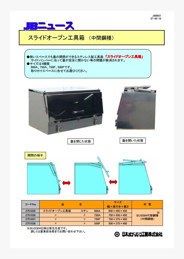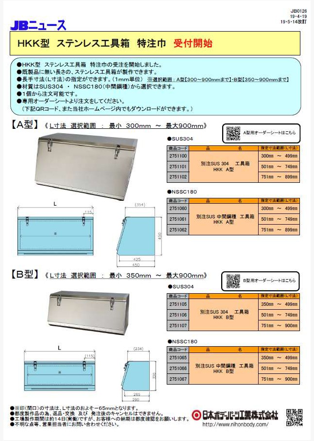 HKK型ステンレス工具箱の特注巾の受注を開始しました。既製品に無い長さを指定できます。(指定範囲があります。)専用オーダーシートより注文をお願いいたします。