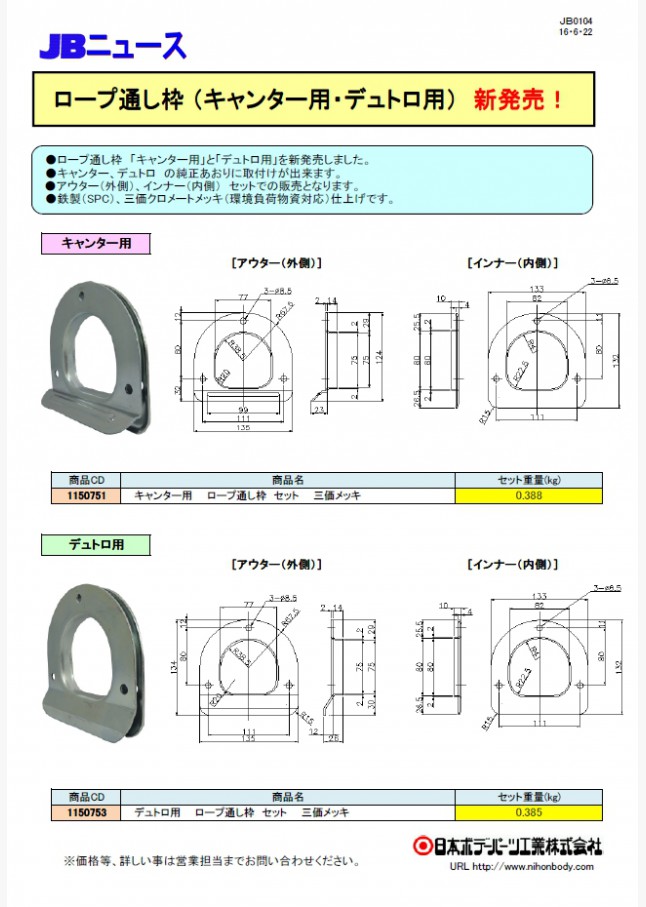 JB0104 ロープ通し枠 (キャンター用・デュトロ用) 新発売