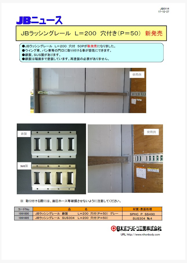 JBラッシングレールの短尺サイズL=350の鉄製・ステンレス製が新発売になりました。ラッシングレールの付いていないあおりに、ラッシングステップを取り付けることができます。既存のL=200と合わせて計4アイテムになります。