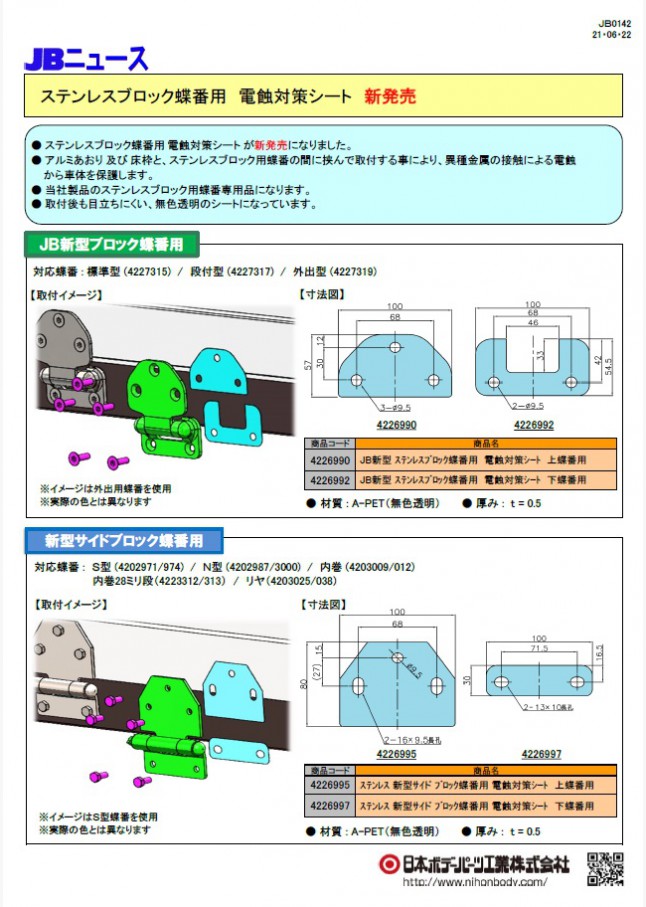 JB0142 ステンレスブロック蝶番用電蝕対策シート 新発売!