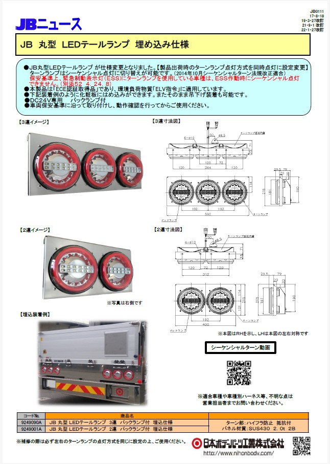 JB丸型LEDテールランプが仕様変更となりました。【製品出荷時のターンランプ点灯方式を同時点灯に設定変更】ターンランプ部はシーケンシャル点灯に切替が可能です。保安基準上、緊急制動表示灯(ESS)にターンランプを使用している車種には、ESS作動時にシーケンシャル点灯できません。(別添52 4.24.8)