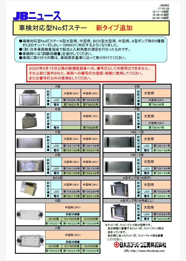 車検対応型No灯ステーA型大型用、A型中型用、BOX型大型用、BOX型中型用、A型ダンプ用大型用 がLEDナンバー灯(LSL-1009AV)に対応するようになりました。(旧基準対応品の為、2020年9月15日以降の新規登録車への、番号灯としての使用はできません。)