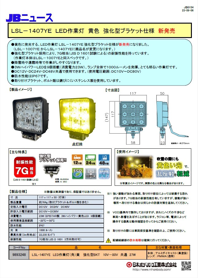 黄色に発光するLED作業灯 LSL-1007YEがLSL-1407YEとして新発売しました。作業灯本体は1007YEと同スペックです。強化型のBKTを採用し、7G相当の耐振性能を持っています。