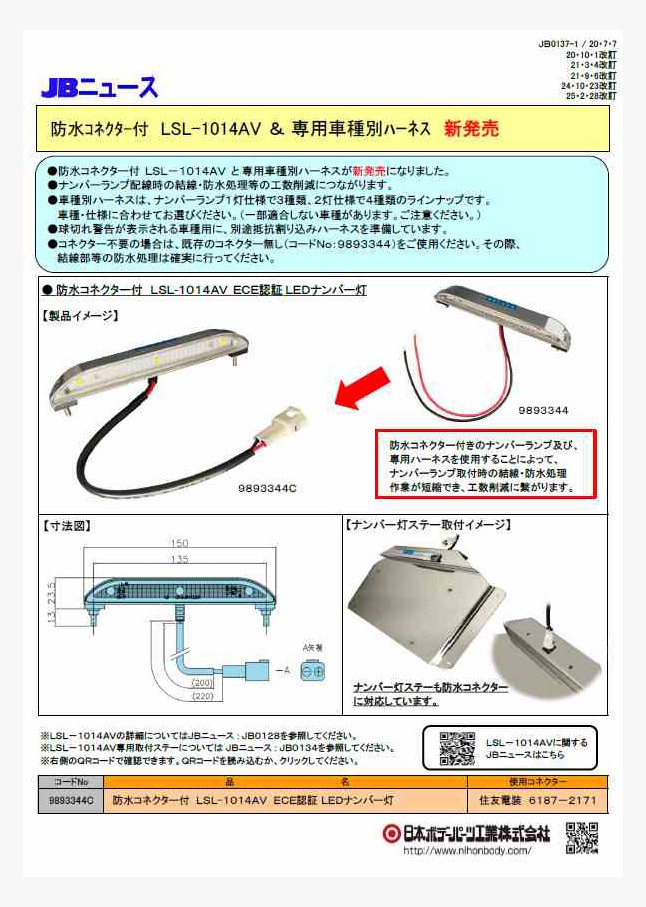 JB0137 LSL-1014AV 防水コネクター付き & 専用車種別ハーネス 新発売!