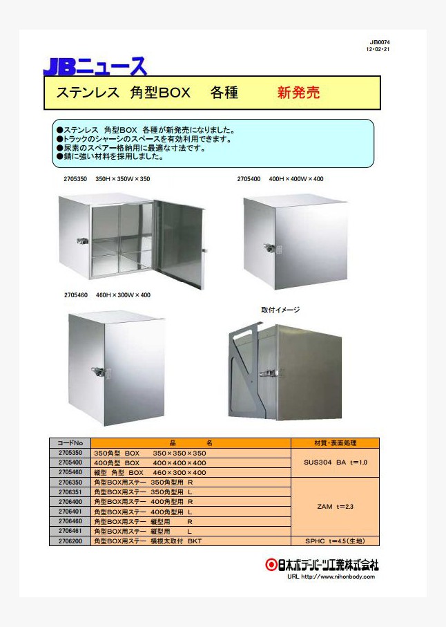 クレーン付きトラック等に使用するアウトリガー敷板用の格納BOXが新発売になりました。3種類の敷板サイズに対応。それぞれステンレス製・鉄製(カチオン黒塗装)があります。別売の専用ストッパーと尾錠の取り付けで、敷板本体の飛び出しを抑えることができます。