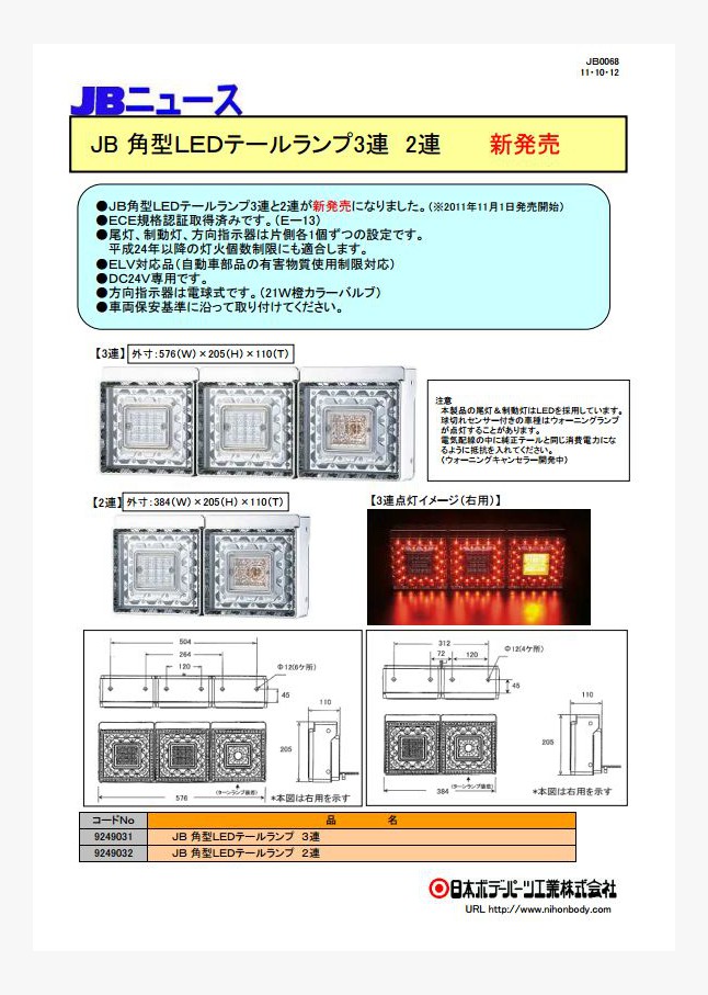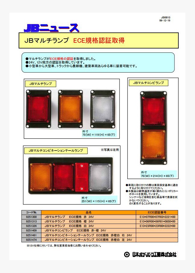 オールLEDタイプのマルチテールランプを新発売しました。DC24V専用、ECE認証取得品、環境負荷物質ELV指令適応。従来の電球タイプと寸法的に互換性あります。小型車から大型車、トラックから農耕機、建築車両などあらゆる車に装着可能です。
