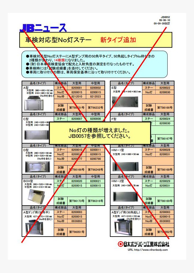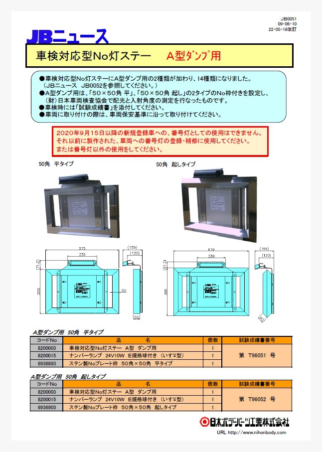 車検対応型No灯ステーにA型ダンプ用の50角平タイプ、50角起しタイプNo枠付きの2種類が加わり、14種類になりました。