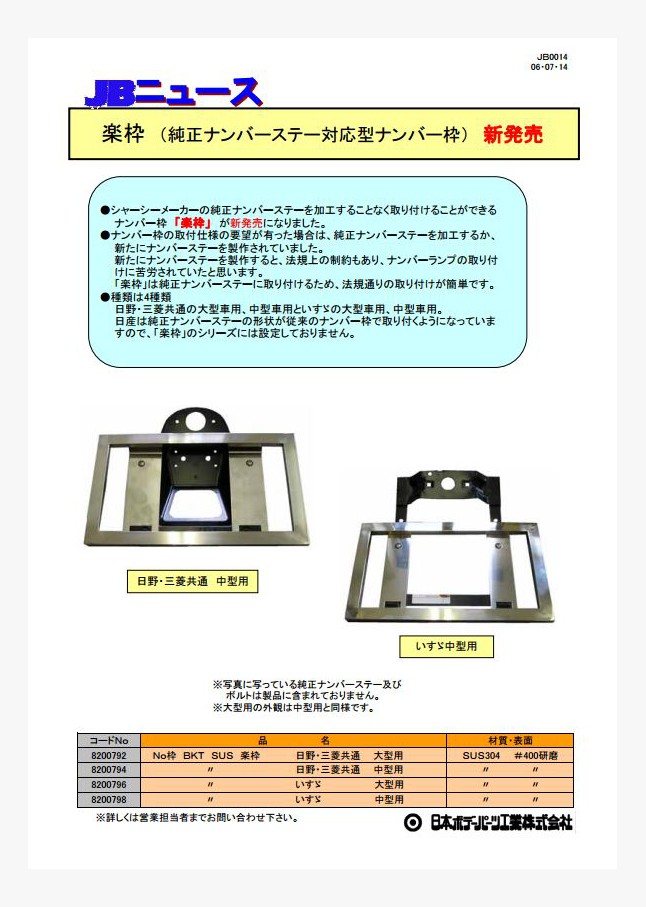 JB0140 ステンレスナンバープレート枠 薄型プレス型 新発売!
