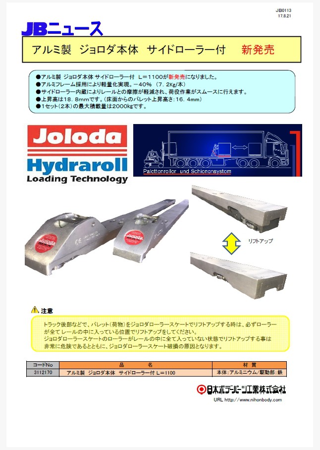 アルミ製ジョロダ本体 フラットタイプ L=1100用が新発売になりました。ジョロダ・ハイドラロール社、初となるフラット構造のアルミ製ローラースケートです。パレットの下をくぐらせて引き出すことができ、安全で効率の良い連続作業が可能です。