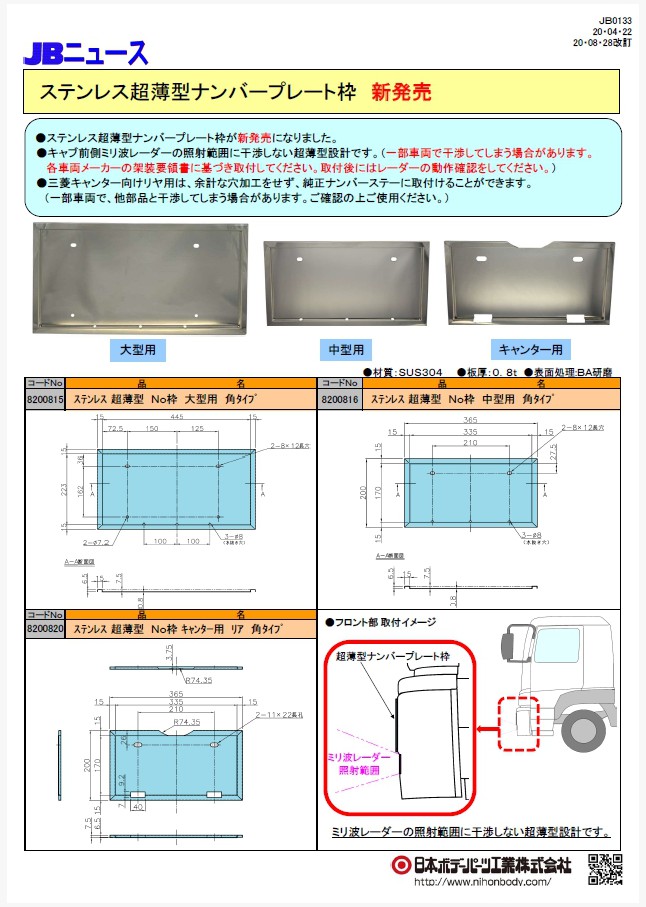 ミリ波レーダーの照射範囲に干渉しない超薄型タイプのナンバープレート枠です。 大型用・中型用があります。キャンターリヤ用は純正ナンバーステーに加工無しで取付可能です。(一部車両を除く)