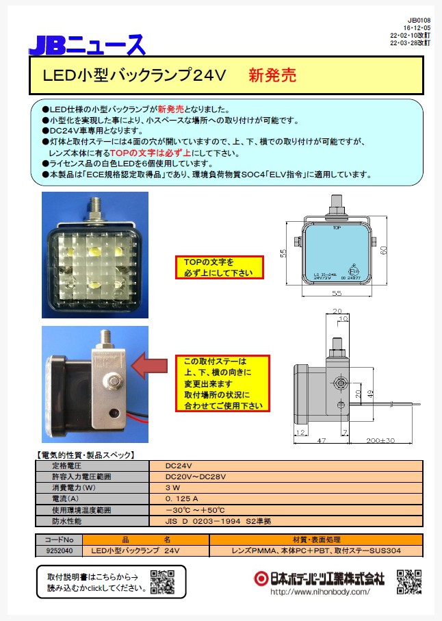 LED仕様の小型バックランプを新発売しました。小さなスペースでも取り付けが可能です。DC24V車専用。