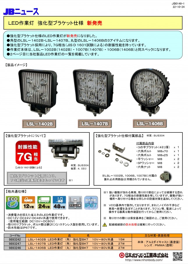 強化型ブラケット仕様のLED作業灯が新発売になりました。角型のLSL-1402B・LSL-1407B、丸型のLSL-1406Bの3アイテムになります。強化型ブラケット採用により、7G相当(JIS D 1601試験による)の耐振性能を持っています。