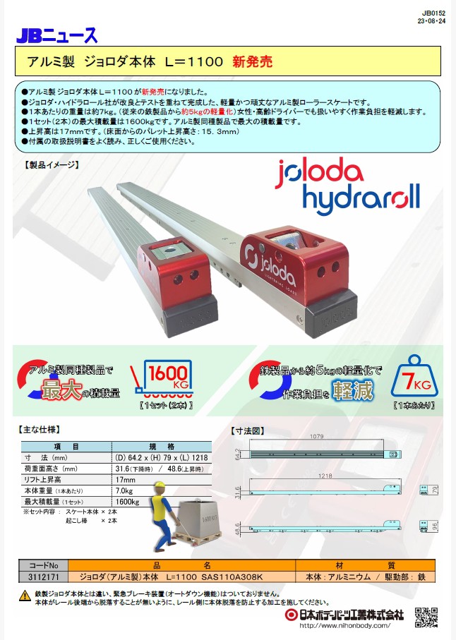 アルミ製ジョロダ本体が新発売になりました。1本あたり7kgの軽量仕様、1セットの最大積載量は1600kgであり、軽量かつ頑丈なアルミ製ローラースケートです。女性・高齢ドライバーでも扱いやすく作業負担を軽減します。