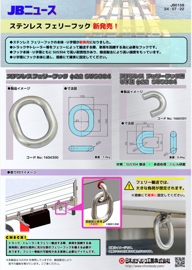 トラックやトレーラー等をフェリーによって輸送する際、車両を固縛する為に必要なフックです。SUS304高い耐食性があり、鍛造製法により高い強度を持っています。