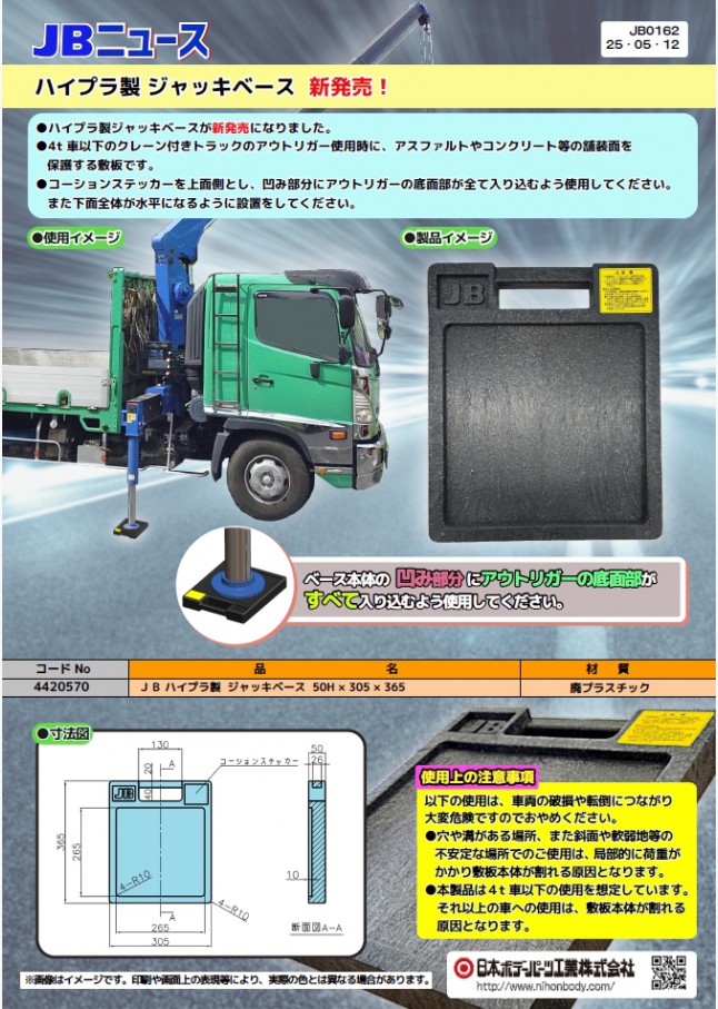 4t車以下のクレーン付きトラックのアウトリガー使用時に、アスファルトやコンクリート等の舗装面を保護する敷板です。