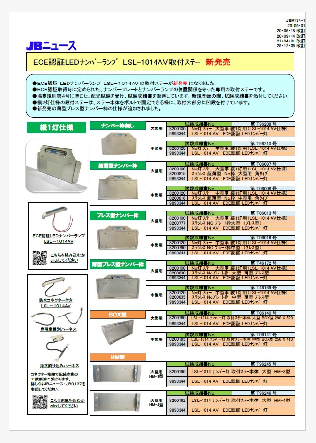 ECE認証ナンバー灯 LSL-1014AVを使用したセット商品の一覧表です。ナンバー灯ステー各種、樹脂製ナンバー枠+専用取付台各種、LSL-1014AV専用車種別ハーネス各種を掲載しています。商品の詳細についてはそれぞれのJBニュースをご確認ください。