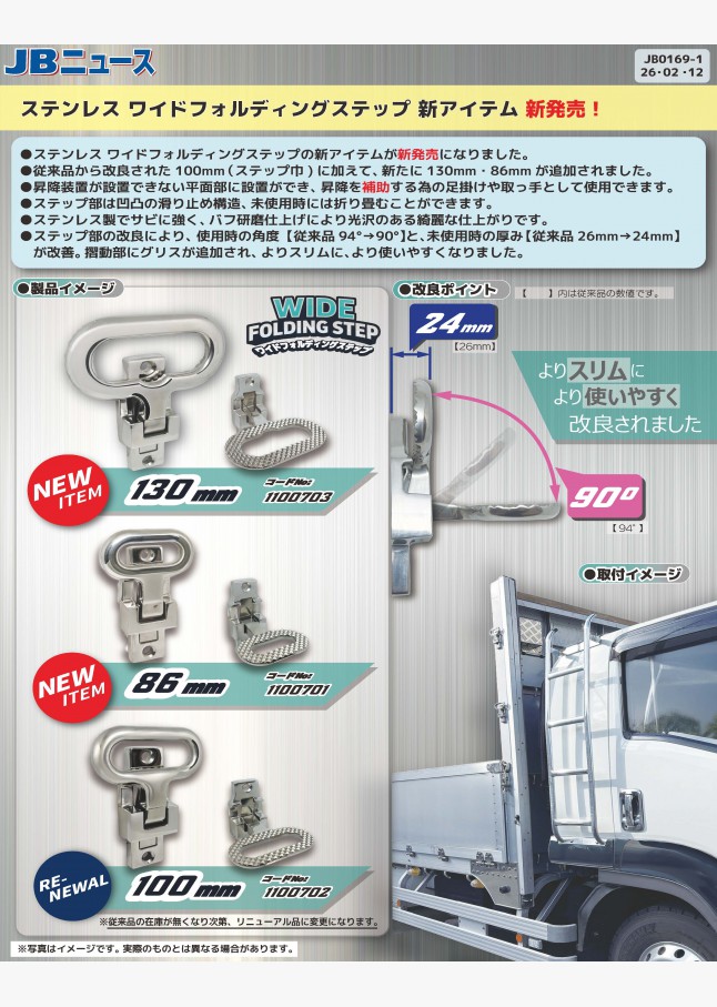 ステンレスワイドフォルディングステップの新アイテムが発売になりました。従来品から改良された100mm巾に加えて、130mm・86mmが追加されました。よりスリムに、より使いやすく改良されました。