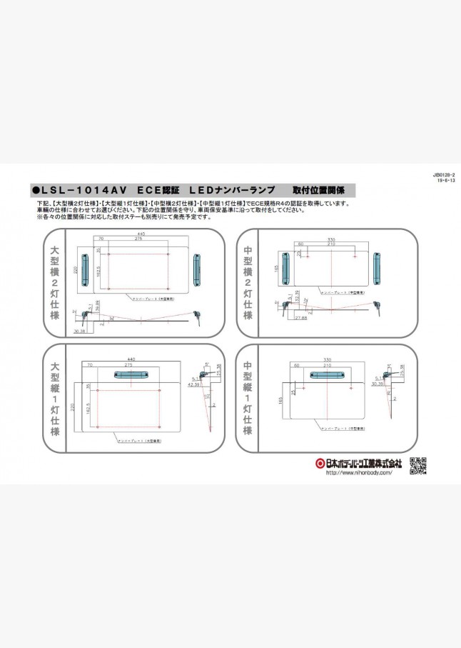 ※LSL-1014AV ECE認証 LEDナンバー灯 取付位置関係一覧表ダウンロード