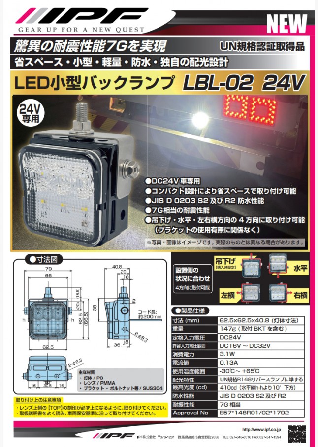 2026年02月02日 LED小型バックランプSM BKT付き 24V LBL-02 24V車専用。コンパクト設計により省スペースで取付が可能なLEDバックランプです。設置側の状況に合わせブラケット位置を4方向に動かすことができます。